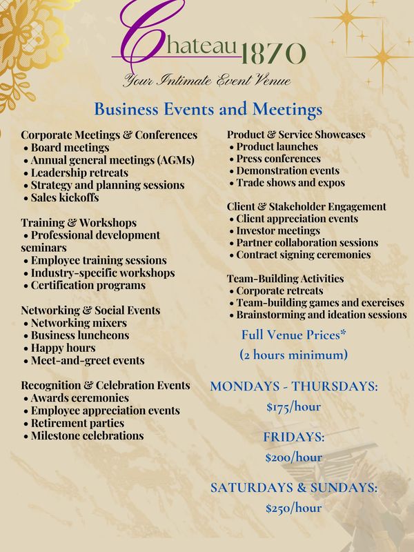 Chateau1870 offers customizable business event and meeting packages designed to make your sessions seamless and productive.